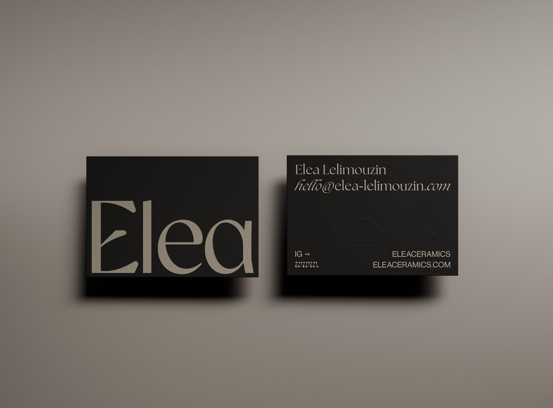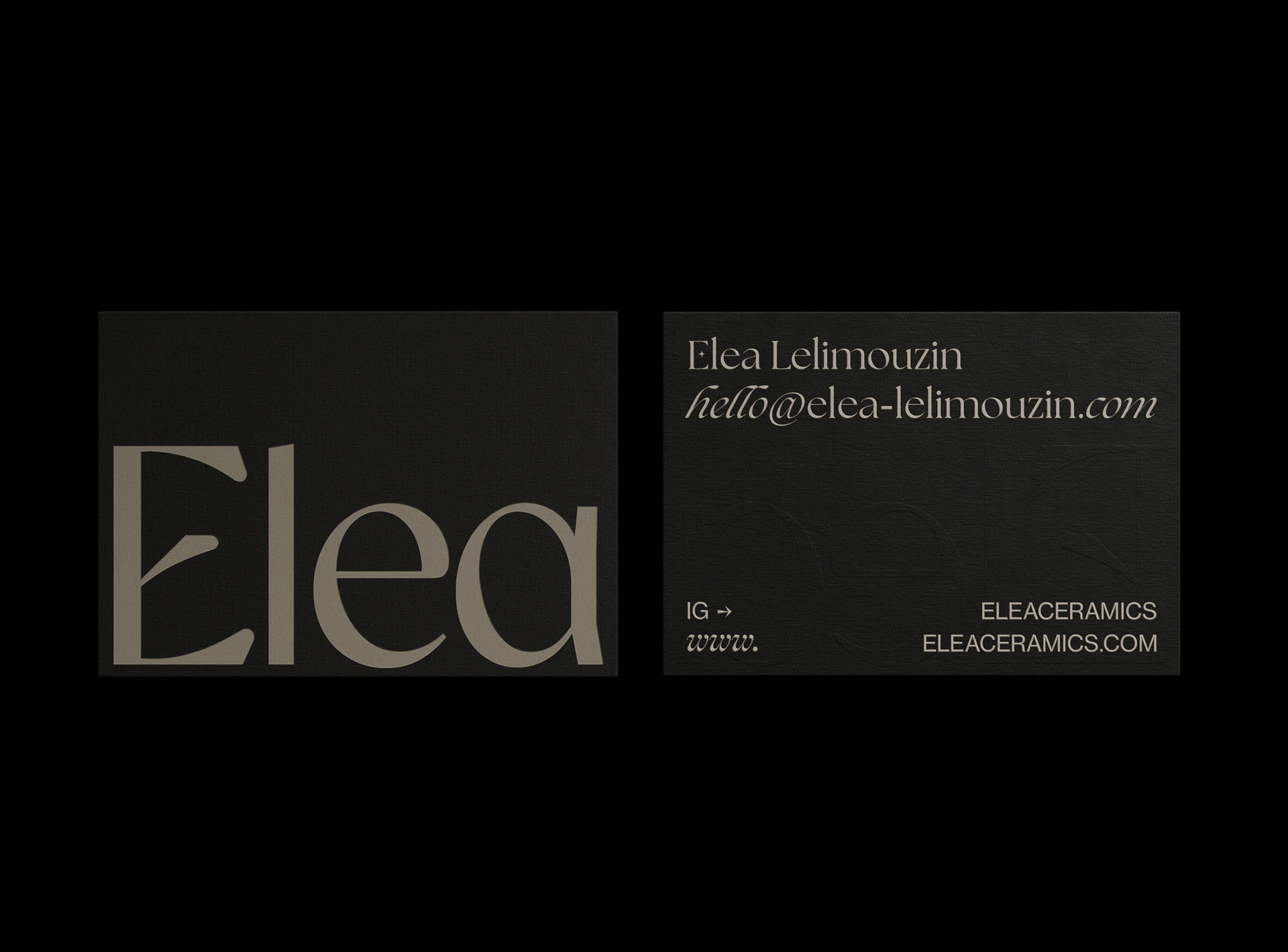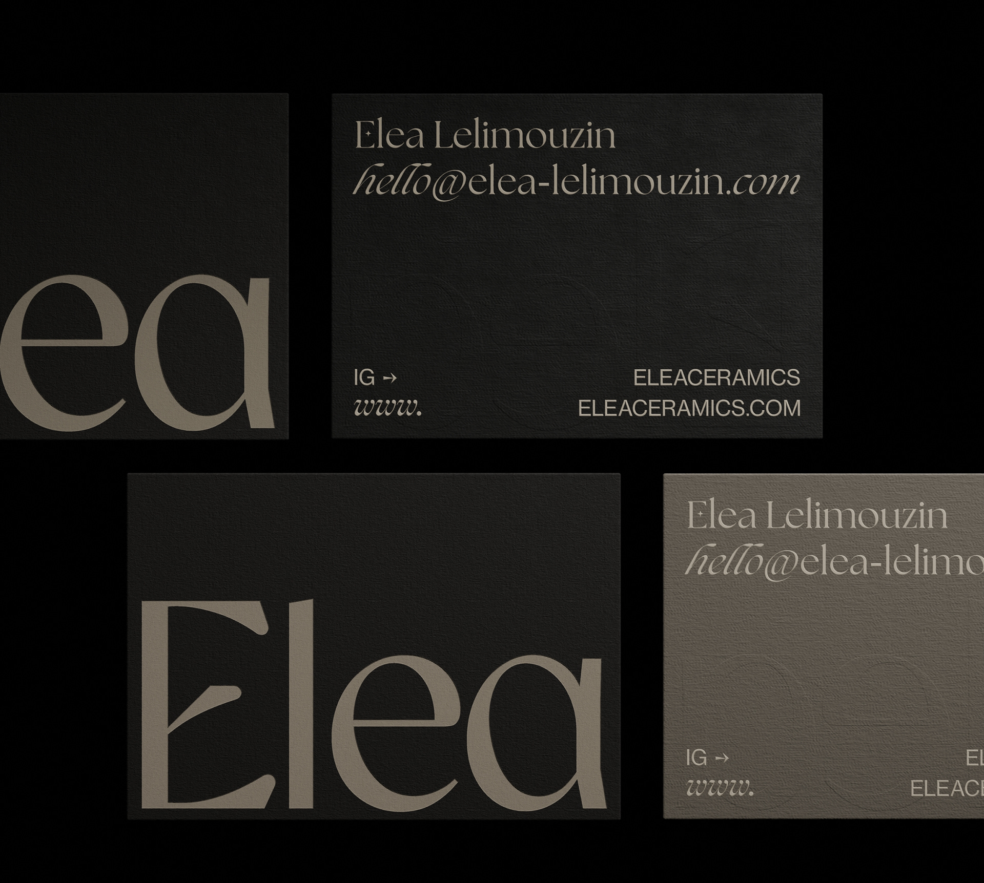 I carefully crafted the studio's identity to reflect the essence and inspiration behind its creations. Through a focus on two nodes, the rustic shades and ash black, along with the inclusion of raw and understated symbols and illustrations, the studio's identity seeks to capture the imperfect and authentic beauty of Elea's work.